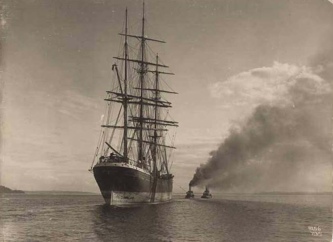 In the 19th and early 20th centuries, sailing ships carried lumber from the northwest to ports all over the world. Moving in and out of ports in Puget Sound could be tricky for these large vessels. They often depended on tugboats to tow them. In this photo, taken in 1906 by Webster & Stevens photographer Homer Davidson, the lumber freighter “Ganges” is being towed by two tugboats. The vessel was headed to pick up a load of lumber at Port Blakely. Its crew then signed on at Port Townsend, and the ship sailed to Callao, Peru to deliver the lumber. The home port of the “Ganges” was Tvedestrand, Norway.