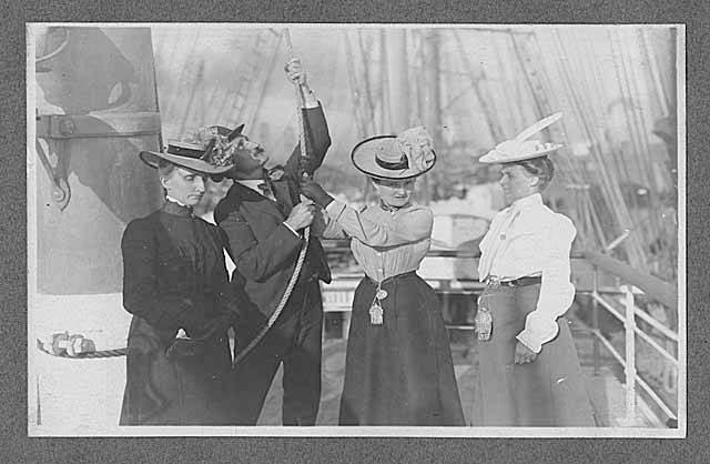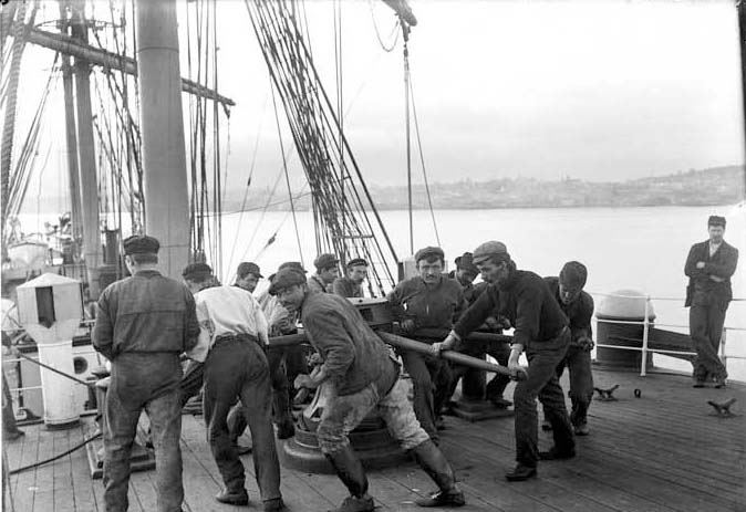 Before the introduction of steam engines to pull up anchors or move heavy weights, sailors had to use muscle power. Stout levers were placed in the holes of a capstan, and the men pushed on the levers to turn the capstan. The turning of the capstan wound up the anchor chain. This photo shows a group of men lifting an anchor with a capstan. It was taken in somewhere in the northern Pacific Ocean, probably around 1900. The age of sail was ending by this time.